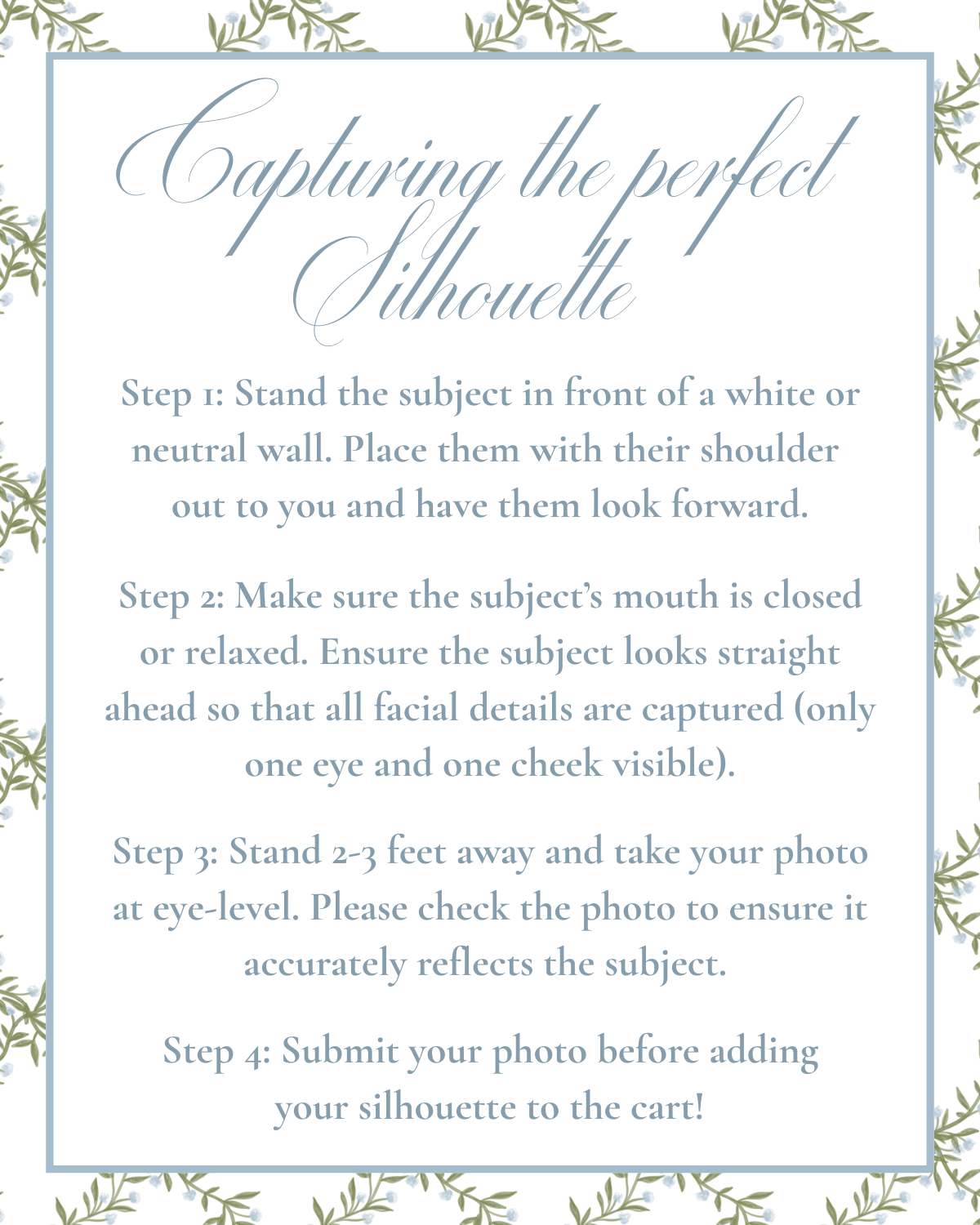 All custom framed silhouettes are stitched and framed by Petite Petal Embroidery Atelier, and are hand-made to order. Additional designs may be requested via our custom order form.